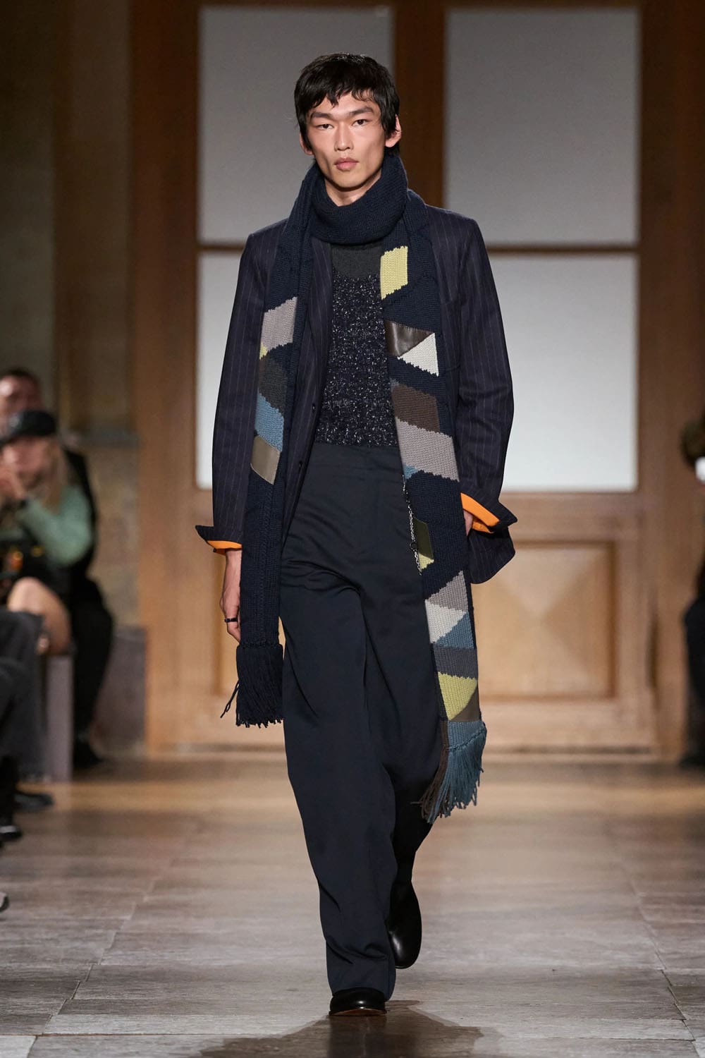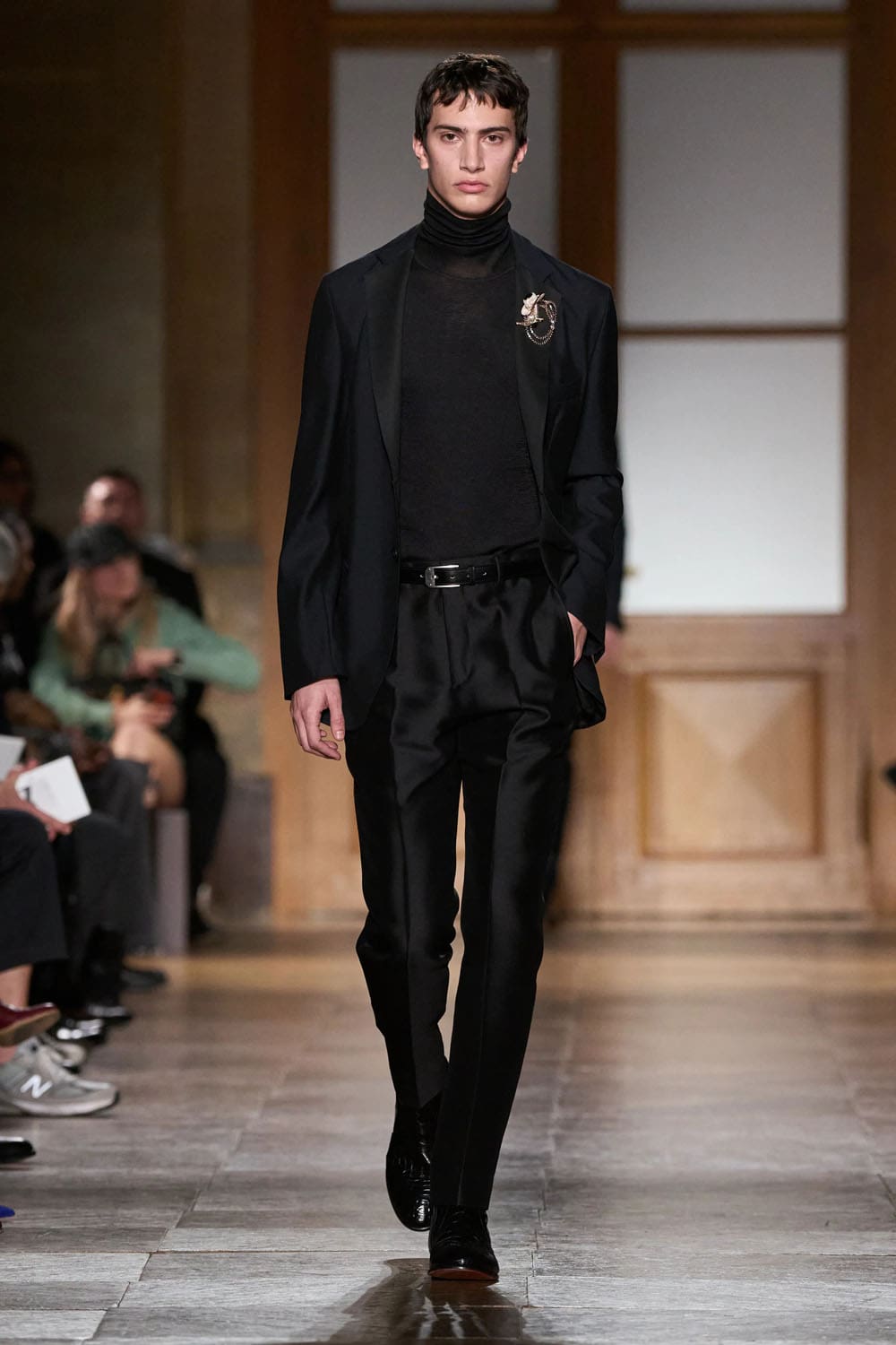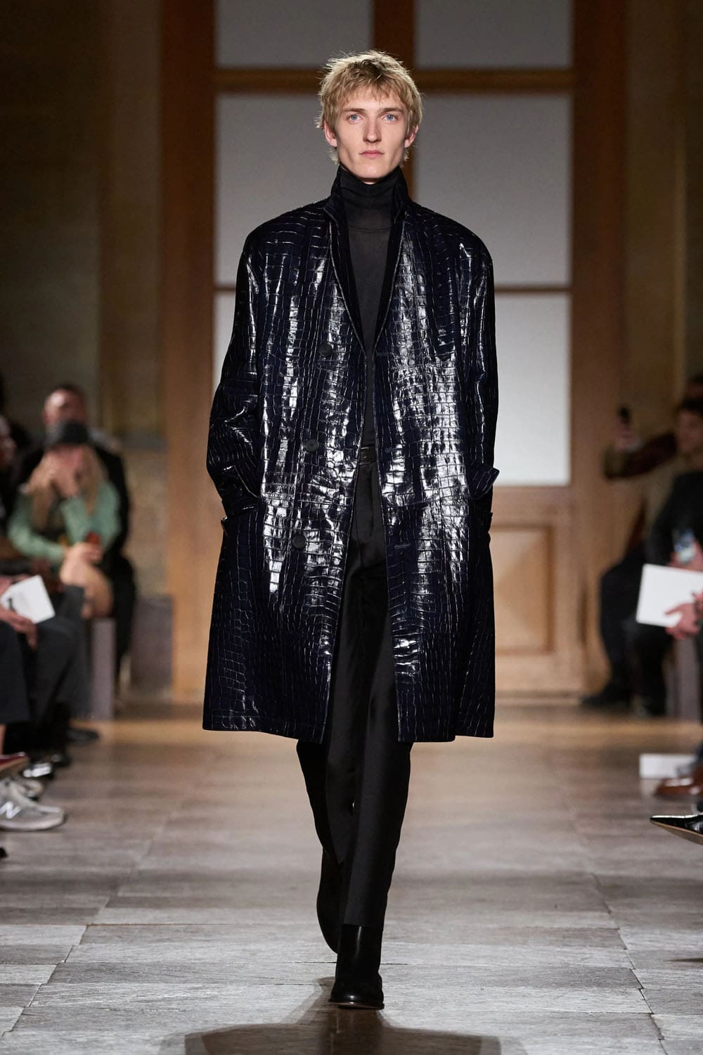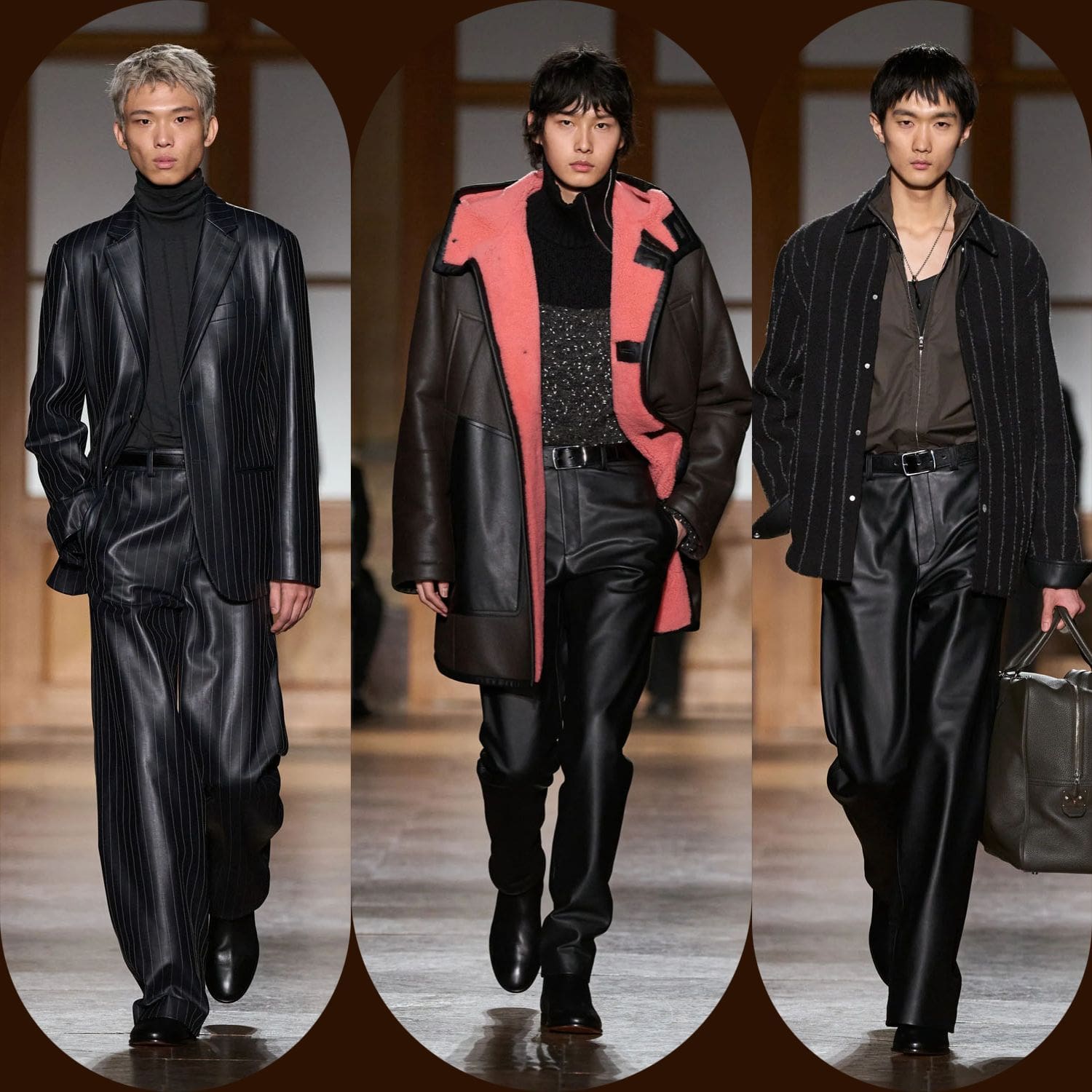 В коллекции присутствовал даже юмор — редкое явление в мире мужской одежды класса люкс. Кожаный чемодан, вырезанный под магнитофон конца 80-х. Розовые пальто из овчины и ботинки на оранжевой подошве, практичные, как альпинистское снаряжение, но без излишней драматичности.